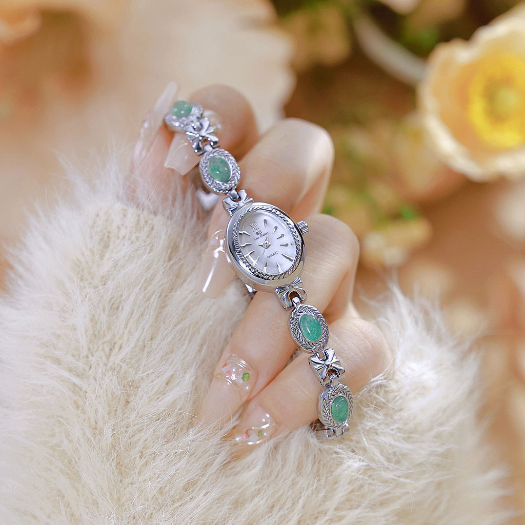 Timeless beauty meets natural elegance. The Jade Gemstone Watch features a delicate oval case with a rope-textured bezel, paired with an exquisite bracelet adorned with luminous jade cabochons. With its natural green jade gemstones set in ornate links, this timepiece brings the serene beauty of nature to your wrist in both gold and silver finishes.