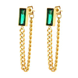 Elevate your style with these stunning gold chain drop earrings featuring a radiant emerald green crystal. Designed with a sleek rectangular stone set in polished gold and paired with chic chain details, these earrings strike the perfect balance between timeless elegance and modern edge. Lightweight and versatile, they’re ideal for adding a pop of colour to your everyday look or making a statement on special occasions. A must-have accessory for jewellery lovers, these green crystal dangle earrings also make a thoughtful gift for someone special.