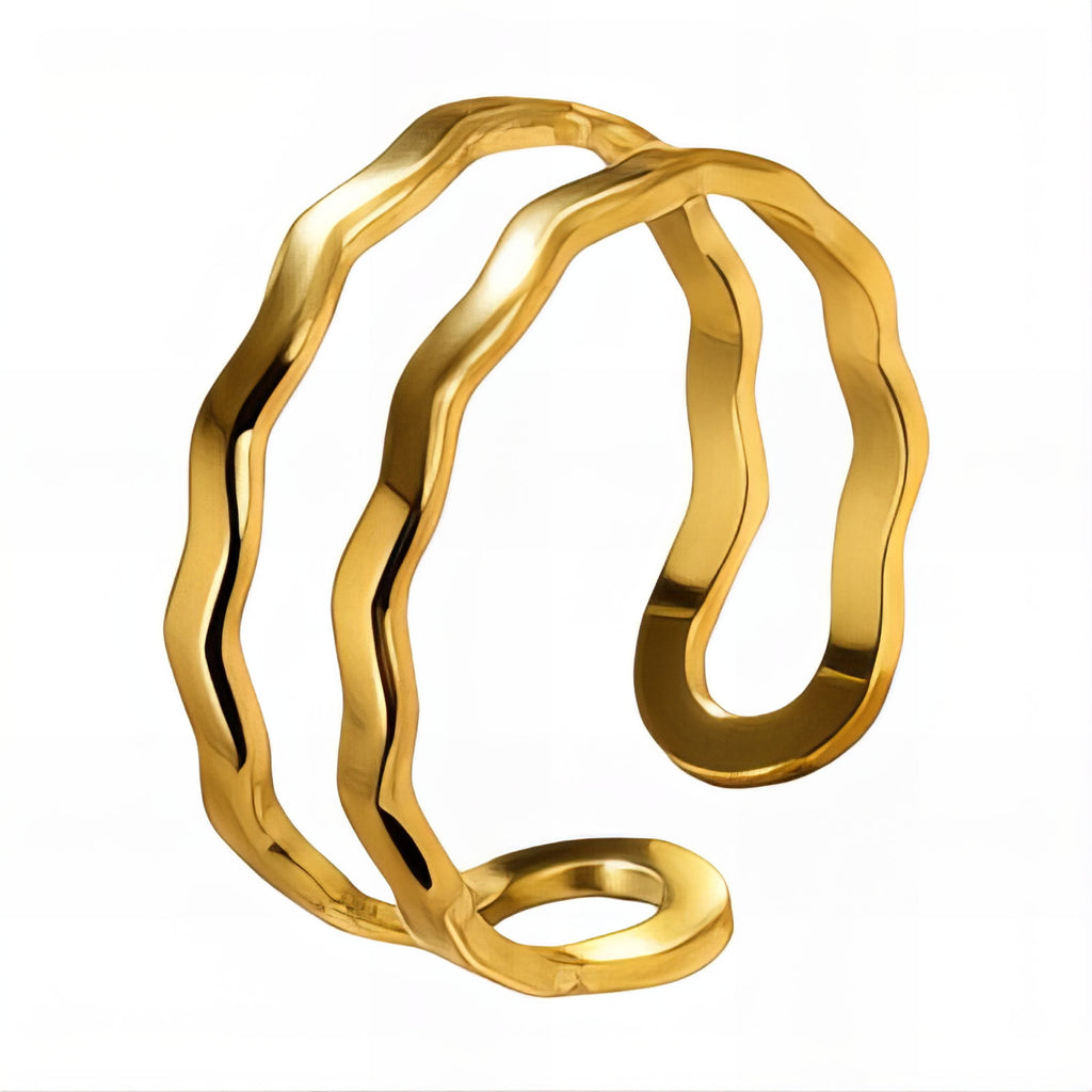 Crafted from 18K gold-plated brass, this unique double-band design flows with organic, wave-like contours that embody both movement and harmony. Its fluid silhouette captures the rhythm of the sea and the boldness of modern architecture, creating a versatile piece that transitions seamlessly from day to night.