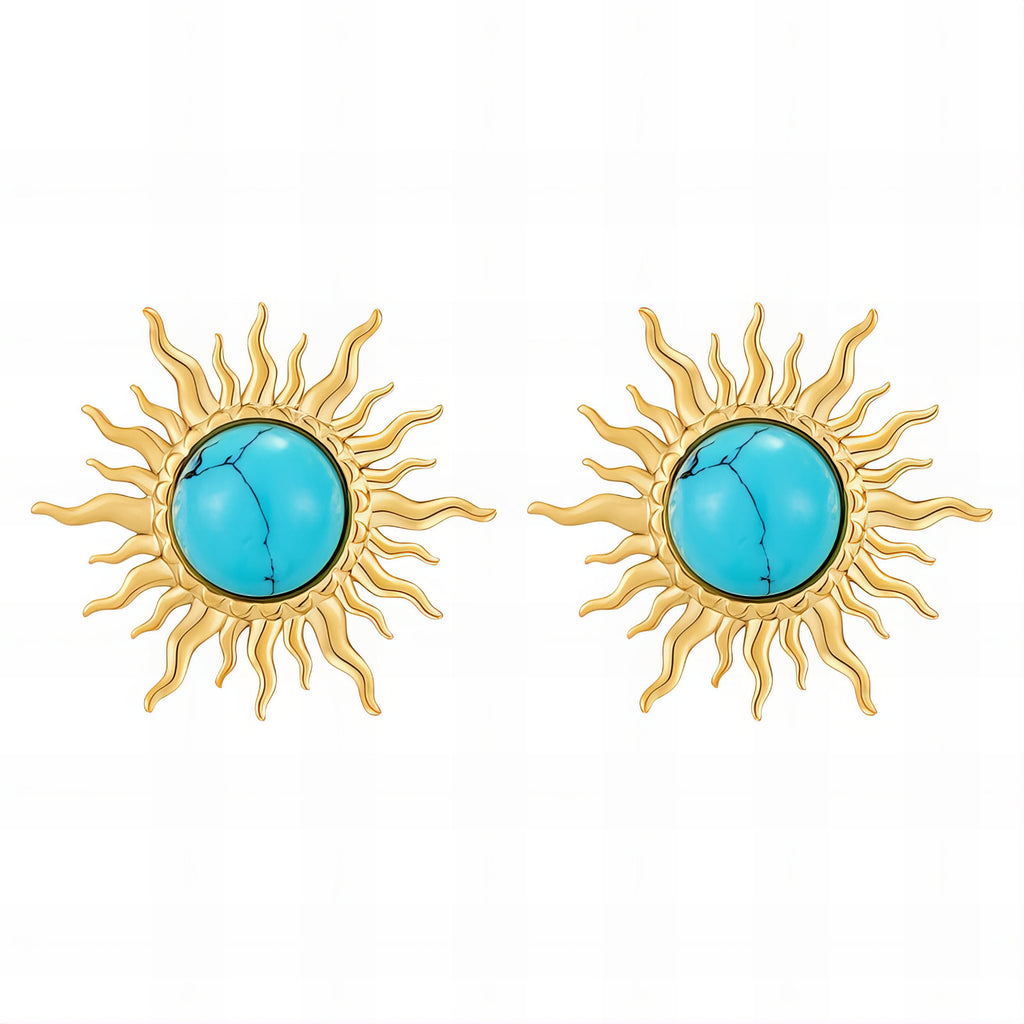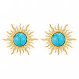 Shine bright with these gold plated sun stud earrings, featuring a vibrant turquoise stone at the center. Crafted from durable stainless steel and finished with a high-quality gold plating, these earrings are tarnish-proof and hypoallergenic, ensuring lasting beauty and comfort. The radiant sunburst design symbolizes positivity and energy, making them a unique accessory for everyday wear or special occasions. Stylish and meaningful, these turquoise sun earrings also make a thoughtful jewellery gift for her.