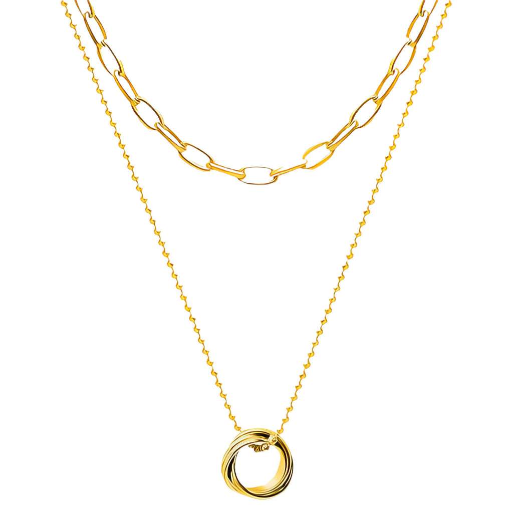 The highlight of the necklace is its interlocking circle pendant, a timeless symbol of unity, eternity, and balance. Crafted from high-quality stainless steel and finished in tarnish-proof 18K gold plating, it ensures both durability and lasting brilliance.