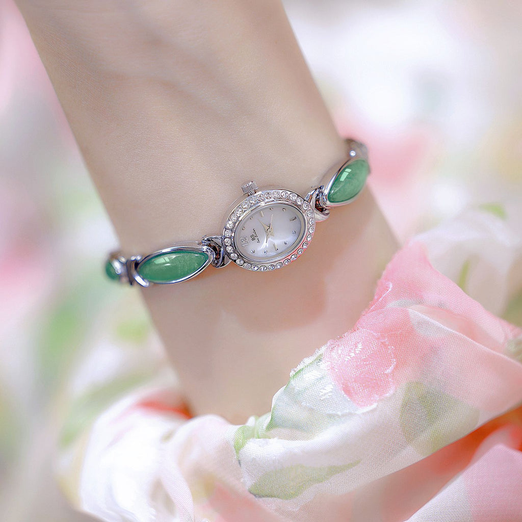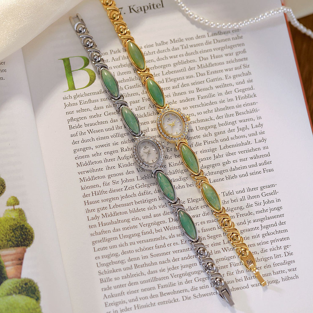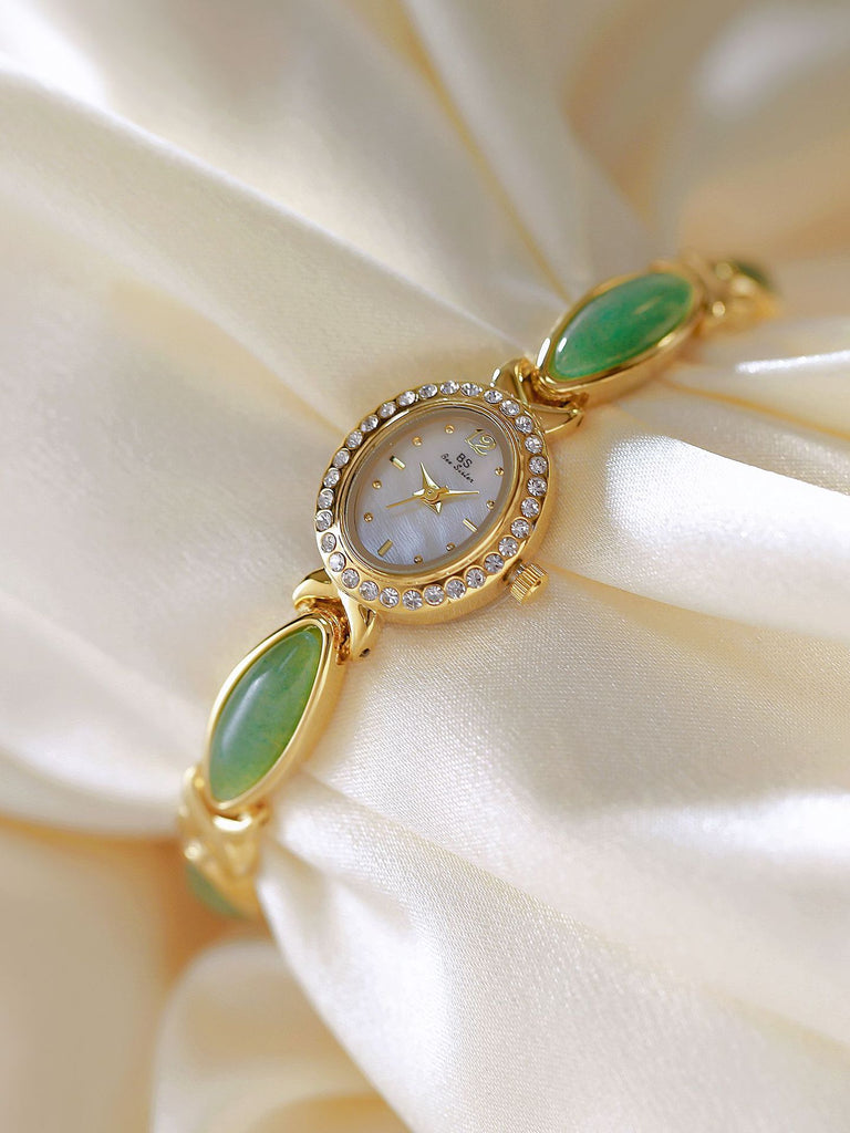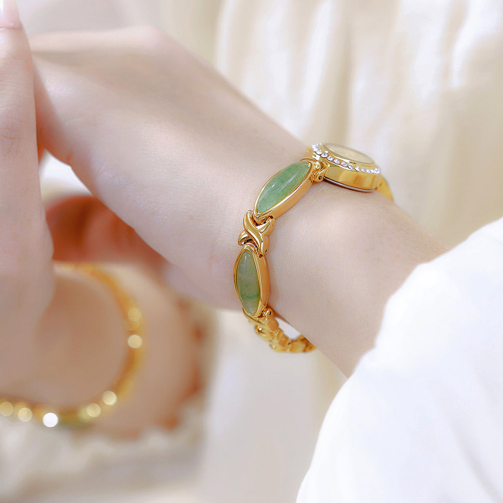 Natural serenity meets elegant design. The Tiger Eye Oval Watch features a crystal-encrusted oval case paired with an exquisite bracelet adorned with luminous aventurine gemstone cabochons. Available in serene green aventurine, warm tiger's eye, or other natural stone variations, this timepiece brings the calming beauty of nature to your wrist in both gold and silver finishes.
